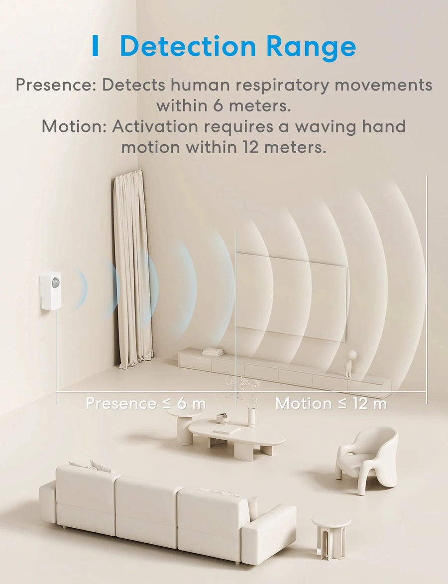 يجمع بين مستشعر الحركة التقليدي (PIR) وتقنية الرادار الموجية “mmWave” – يعني يكتشف ما يكفيك من الحضور حتى لو أحد واقف ساكت بدون ما يتحرك.